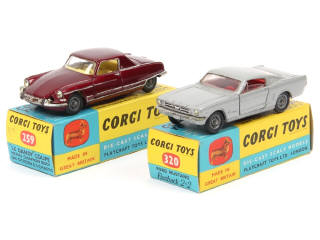 comprend : CITROËN DS coupé 'LE DANDY' (détails de peinture argentée ajoutés - un phare additionnel cassé & manquant - pneus séchés & craquelés) & FORD MUSTANG - manques de pellicule chromée - pneus plus ou moins séchés & craquelés - boites en état 'b' dont une proche de 'a'
