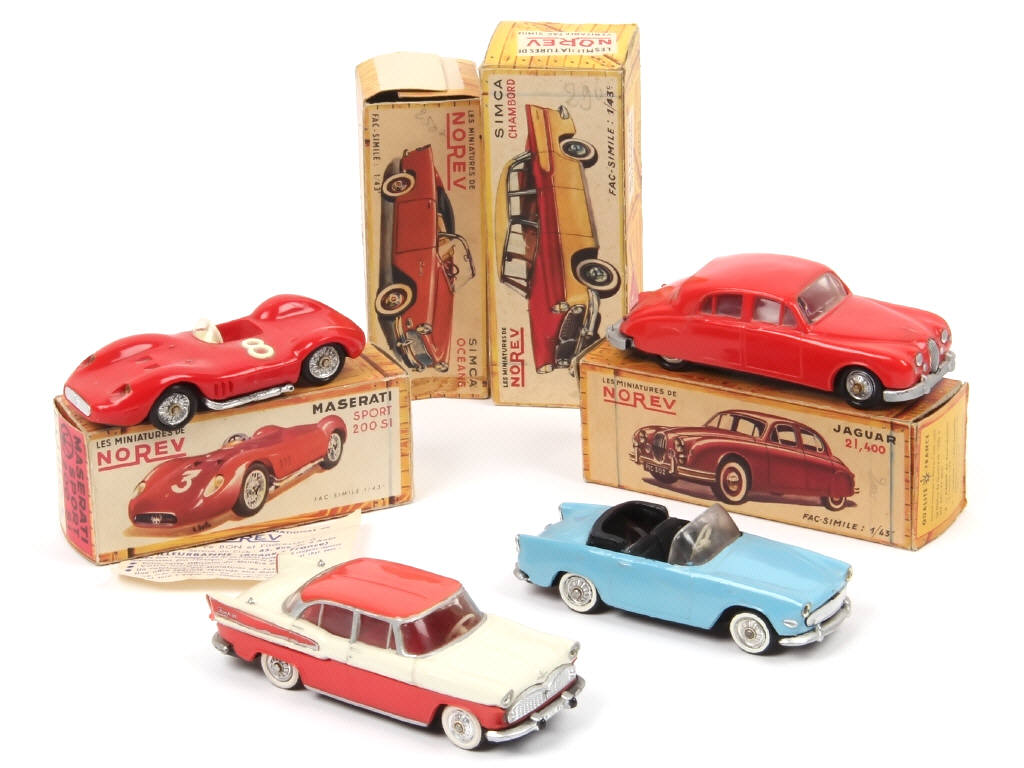 comprend : MASERATI SPORT 200/SI, JAGUAR 2.4 L, SIMCA CHAMBORD & OCEANE - quelques détails de peinture ajoutés, antennes cassées & manquantes sur un exemplaire - quelques traces d'oxydation & carrosseries plus ou moins encrassées - boites en états 'b' & 'd'