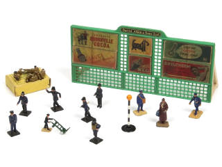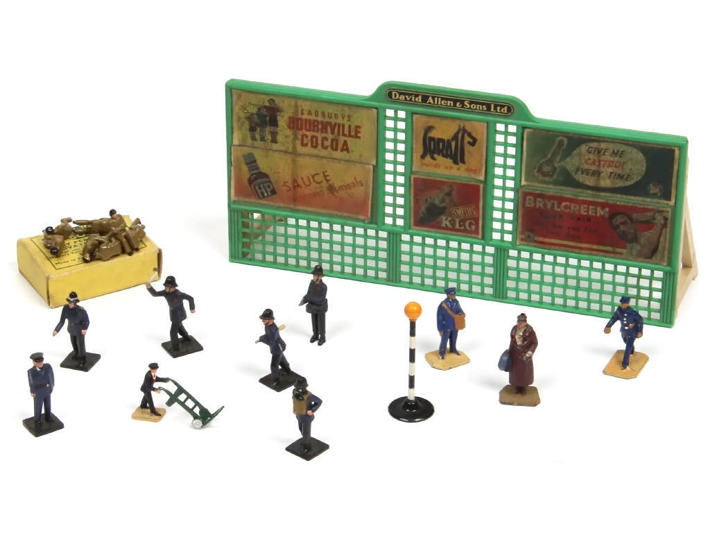 comprend notamment : coffret ARMY PERSONNEL (avec 7 soldats), personnel de gare, pompiers & panneau d'affichage 'DAVID ALLEN & SONS LTD' (publicités tachées - ensemble encrassé) - on y retrouve notamment les marques : DINKY TOYS (GB) & HORNBY