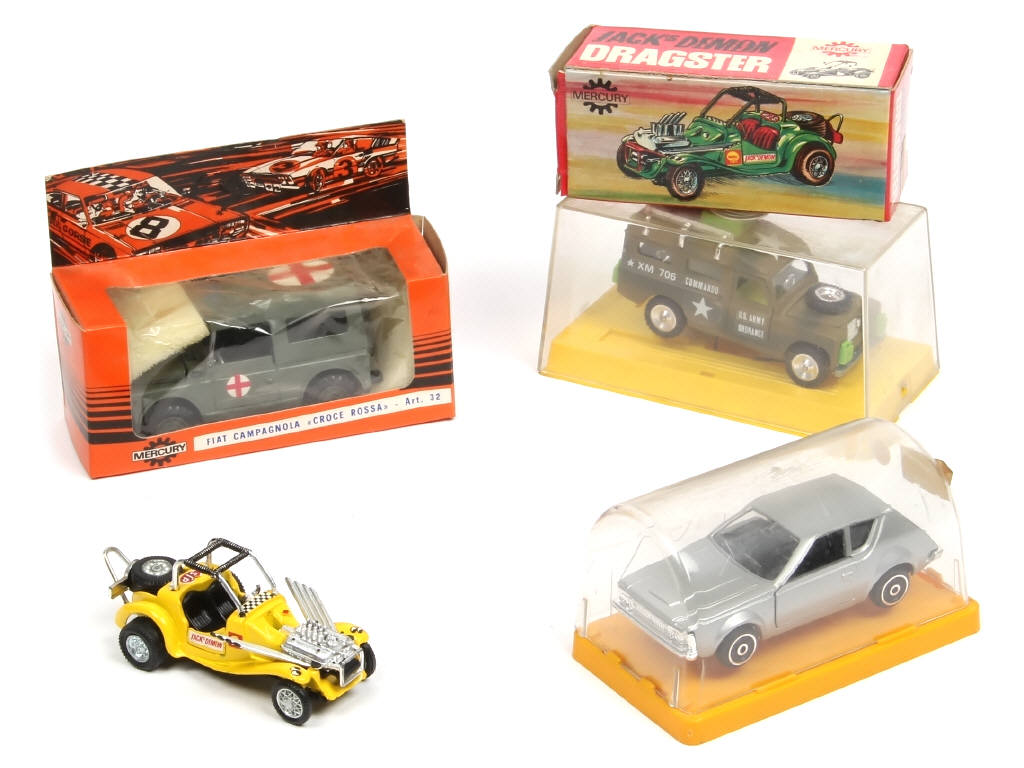 comprend : DRAGSTER 'JACK'S DEMON' (manque un feu - boite sans mousse de protection), AMC GREMLIN, LAND ROVER 'ARMY' & FIAT CAMPAGNOLA 'CROCE ROSSA' - on y retrouve les marques : MERCURY, POLISTIL & MEBETOYS