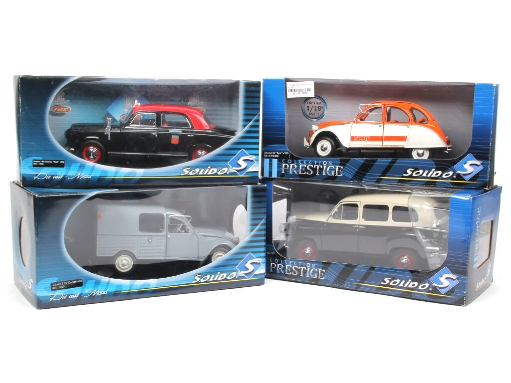 échelle 1/18ème - comprend : CITROEN 2CV SPOT 1976, camionnette, PEUGEOT 403 berline 'TAXI' 1965 & RENAULT COLORALE TAXI 1953 - possibilité de fixations de socle manquantes