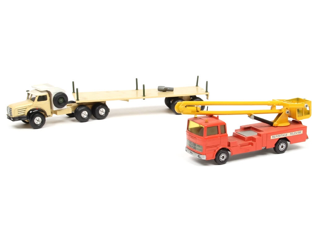 comprend : MERCEDES LP 14 18 avec nacelle 'REPORTAGE TELEVISE' & BERLIET TBO Pétrolier saharien (sans chargement - version jantes métal - avec clef)