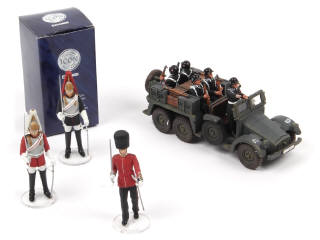 longueur du véhicule : 19 cm - hauteur des figurines 9 cm - on y retrouve 6 soldats SS & 3 soldats britanniques - on y retrouve les marques : KING/COUNTRY & CORGI TOYS - quelques petites déformations par endroits - 2 figurines sans boîte