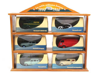 comprend notamment les modèles : 1000 KG, FRÉGATE, 4L & JUVAQUATRE - on y joint une étagère en bois vissée 'LES PETITS UTILITAIRES FRANÇAIS 1950 - 1960' avec quelques frottements