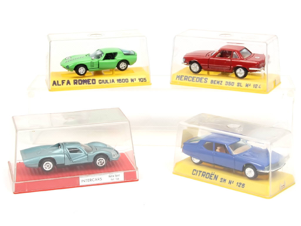 comprend : CITROEN SM, MERCEDES 350 SL, ALFA ROMEO GIULIA 1600 & MATRA SPORT - on y retrouve les marques : JOAL & NACORAL - quelques fêlures sur certains couvercles de boites (un couvercle en partie opacifié)