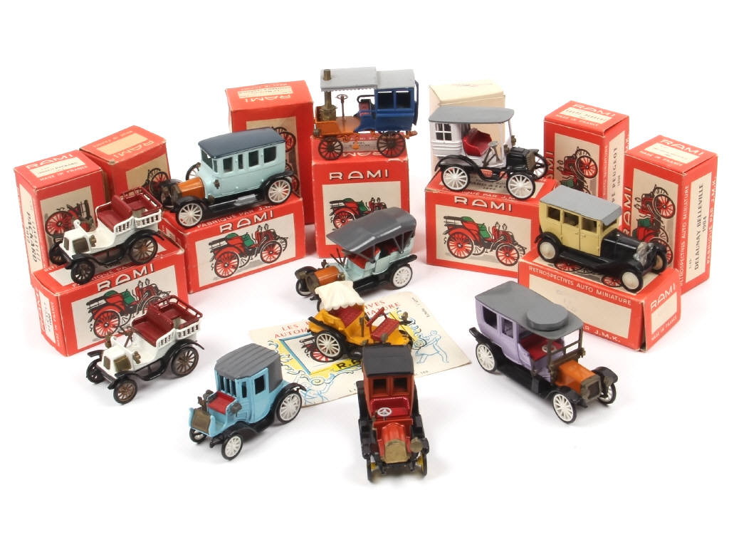 miniatures reproduisant notamment les modèles : CITROËN, PANHARD/LEVASSOR, RENAULT & PEUGEOT - les boîtes sont en états de 'b' à 'c' (possibilité de boîtes non conformes, annotation sur un exemplaire) - avec quelques manques & parties cassées - on y joint un catalogue de la marque en état 'b'