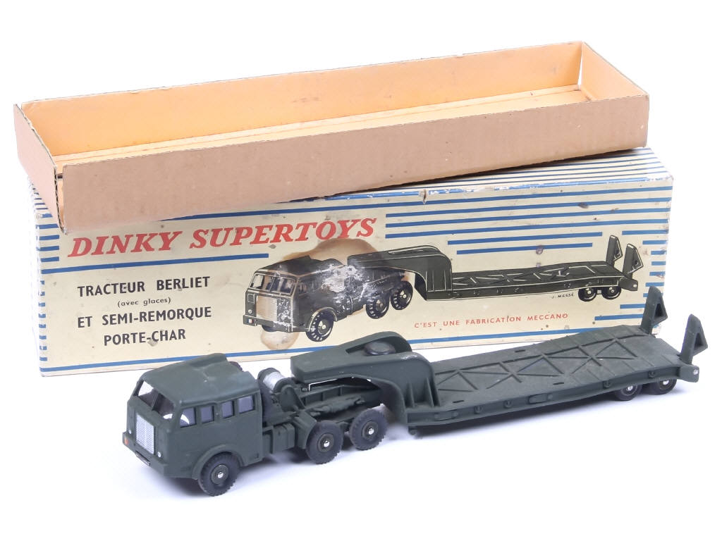 DINKY TOYS (FRANCE) 890 BERLIET Transport de char (version avec jantes du tracteur & de la remorque concaves) kaki