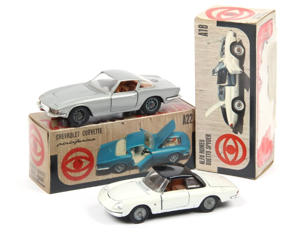 comprend : ALFA ROMEO DUETTO SPYDER (état 'B.c' - quelques éclats - important manque de papier sur une face de boite) & CHEVROLET CORVETTE COUPE RONDINE (état 'A-.c' - traces de colle d'origine autours des phares - boite déformée & blister déchiré) - jantes ternies & axes de roues oxydés