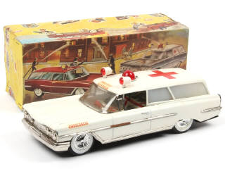 longueur : 32,5 cm - avec moteur à friction, feux de toit mobiles, bruiteur (fonctionnent) & gyrophare électrique (non testé) - jantes très légèrement fondues - une trace d'oxydation sur la baguette de caisse gauche - quelques petits accrocs sur la boîte par endroits (légèrement salie & déformée)