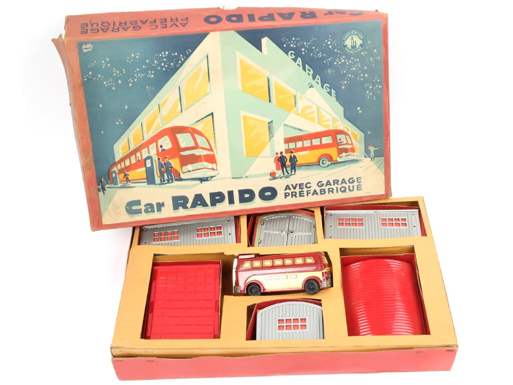 dimensions du coffret : 44 x 27 cm - contient : un autocar 'BROADWAY' avec moteur à friction (fonctionne) & un garage en tôle à assembler - parties chromées plus ou moins ternies - boîte légèrement décolorée, plus ou moins déchirée avec agrafes oxydées - un petit manque sur la cale de boîte