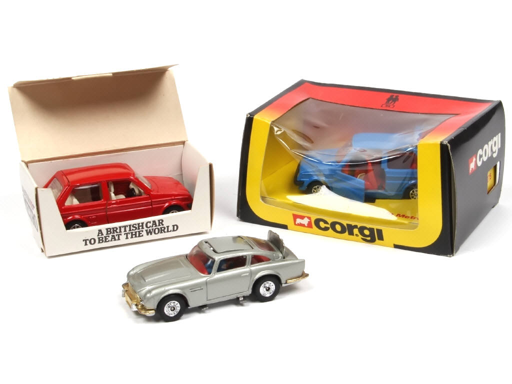 comprend : AUSTIN METRO & ASTON MARTIN DB5 (pare-balles arrière avec petits éclats & fonctionnant poussivement) - un blister de boite froissé