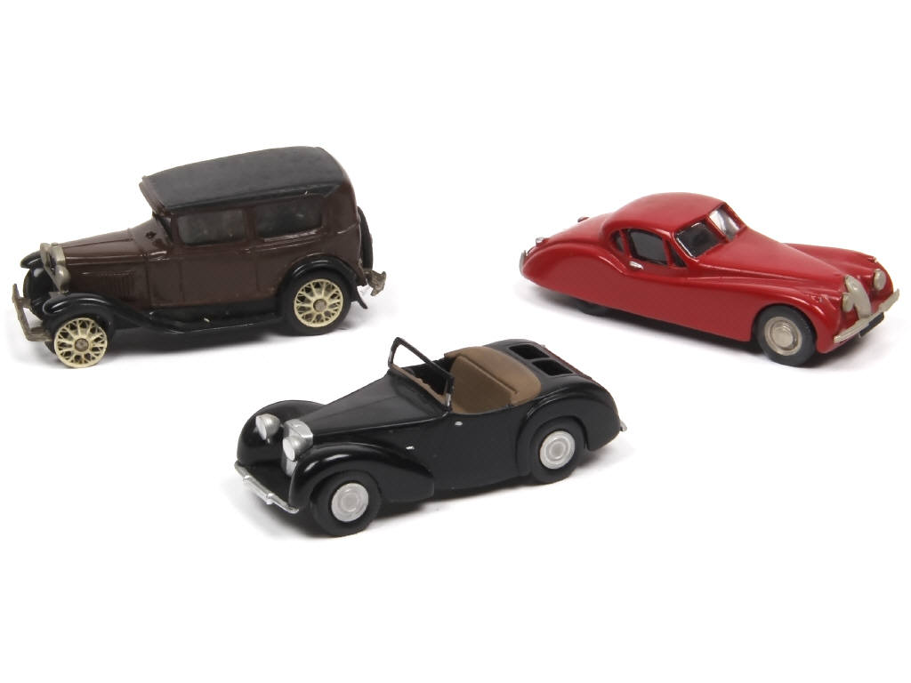 comprend : FORD MODEL A 1930 (modèle encrassé), TRIUMPH 1800 1947 & JAGUAR XK 120 coupé - petits manques & parties cassées ou déformées sur 2 exemplaires - on y retrouve les marques : BROOKLIN MODELS, MIKANSUE & WESTERN MODELS (kit monté)