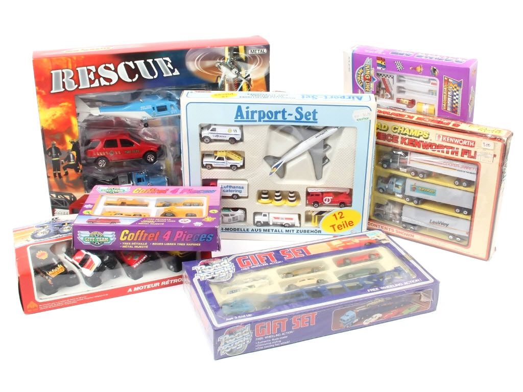 différentes échelles - on y retrouve notamment les marques : MAJORETTE, ROAD CHAMPS & MC TOY - possibilité de petits accessoires manquants & de petites parties cassées - les boîtes sont en états de 'b' à 'c'
