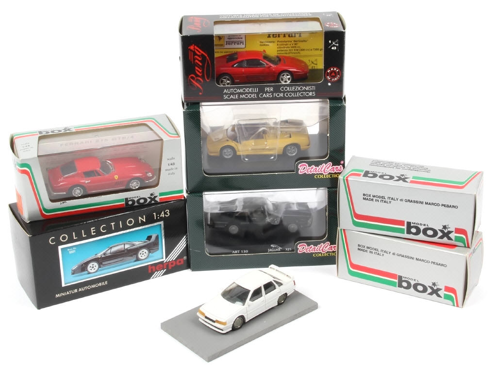 miniatures reproduisant notamment les modèles : JAGUAR, LAMBORGHINI, FERRARI & RENAULT - on y retrouve les marques : MODEL BOX, HECO-MODELES, BANG, HERPA & DETAILCARS - quelques accrocs sur certaines boîtes