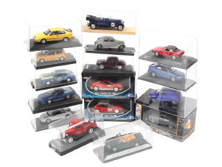 miniatures reproduisant notamment les modèles : PEUGEOT, FORD & FIAT - on y retrouve notamment les marques : NEW RAY (boîte non conforme), SOLIDO & MINICHAMPS - possibilité de petits accessoires manquants - les boîtes sont en états de 'a' à 'b'