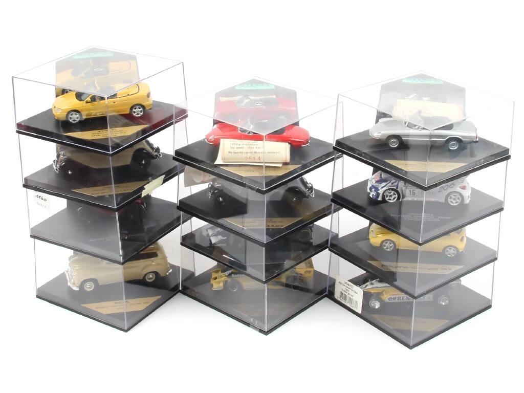 miniatures reproduisant notamment les modèles : RENAULT, PEUGEOT, ALFA ROMEO & CITROËN - on y joint une SAUBER de la marque ONYX & une RENAULT F1 de la marque QUARTZO (boîte non d'origine) - quelques boîtes en état 'c' & plus ou moins tachées - possibilité de petits accessoires manquants