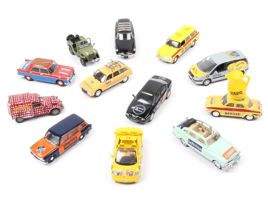 miniatures reproduisant les modèles : PEUGEOT, CITROËN, FIAT, RENAULT, VOLKSWAGEN, ALFA ROMEO & FORD - on y retrouve notamment les marques : NOREV & SOLIDO - 2 exemplaires transformés - quelques petits manques & parties cassées