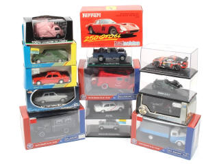 miniatures reproduisant notamment les modèles : FERRARI, BMW & FORD - on y retrouve notamment les marques : ELIGOR, BRUMM (2 accessoires à refixer), SOLIDO & JOUEF EVOLUTION - possibilité de petits accessoires manquants