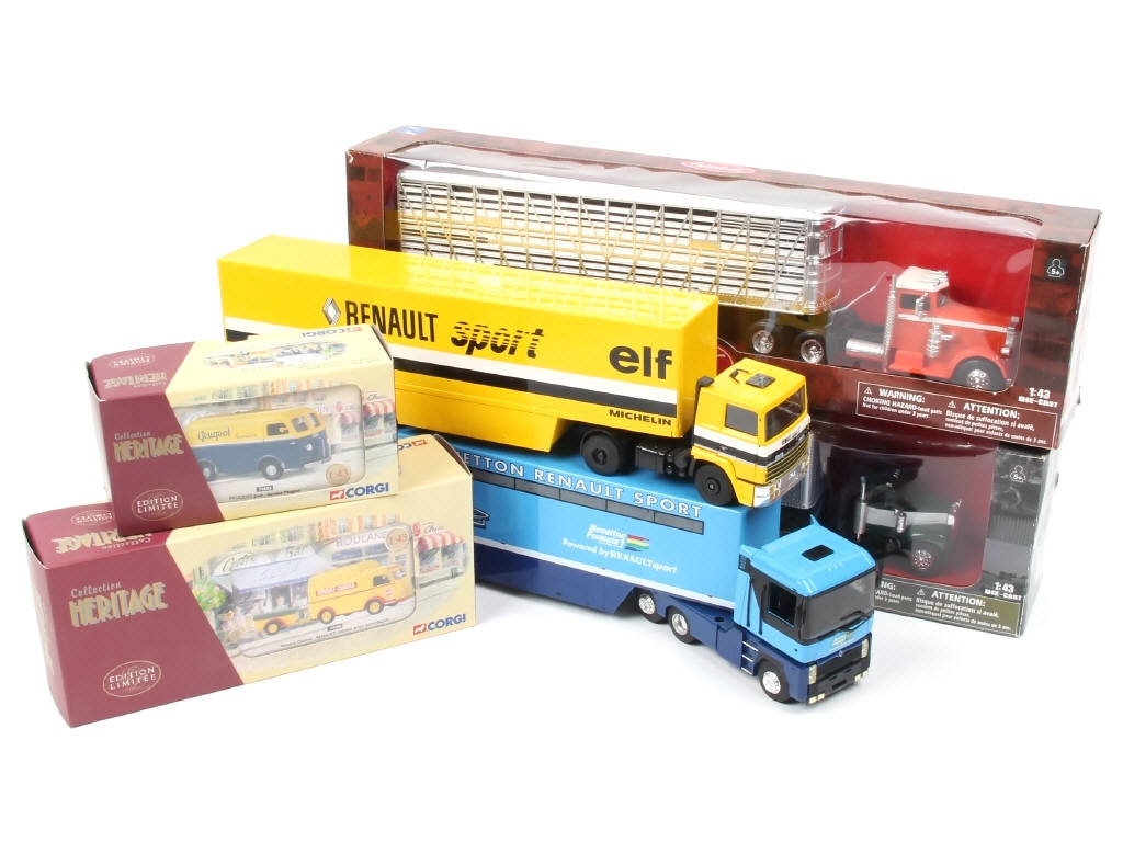 miniatures reproduisant les modèles : RENAULT, PETERBILT, MACK, RENAULT & PEUGEOT - on y retrouve les marques : CORGI TOYS, LBS & NEW RAY - les boîtes sont en états 'a' & 'b' (2 exemplaires sans boîte) - manques quelques accessoires