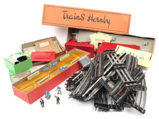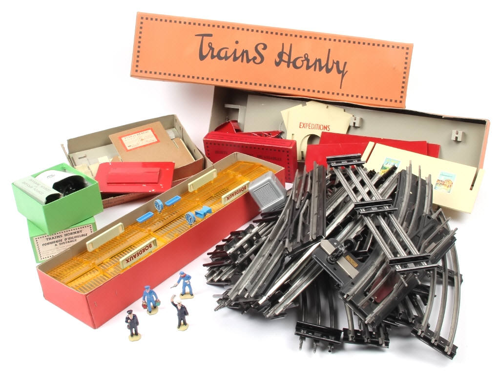 non testé - comprend : différents rails (plus ou moins ternis), une commande d'aiguillage à distance, 4 figurines (avec boîte n°11), une cabine sémaphorique, quai à voyageurs & à marchandises - possibilité de petits manques & parties cassées - les boîtes sont en états de 'b' à 'c'