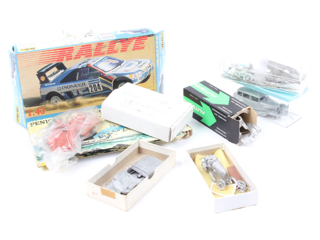 différentes compositions - plus ou moins assemblés - miniatures reproduisant notamment les modèles : BUGATTI, MINERVA & PEUGEOT - on y retrouve notamment les marques : HELLER, GYL & AUTODIN - 4 exemplaires en boîte états de 'c' & 'd' - possibilité de manques & parties cassées (vraisemblablement)