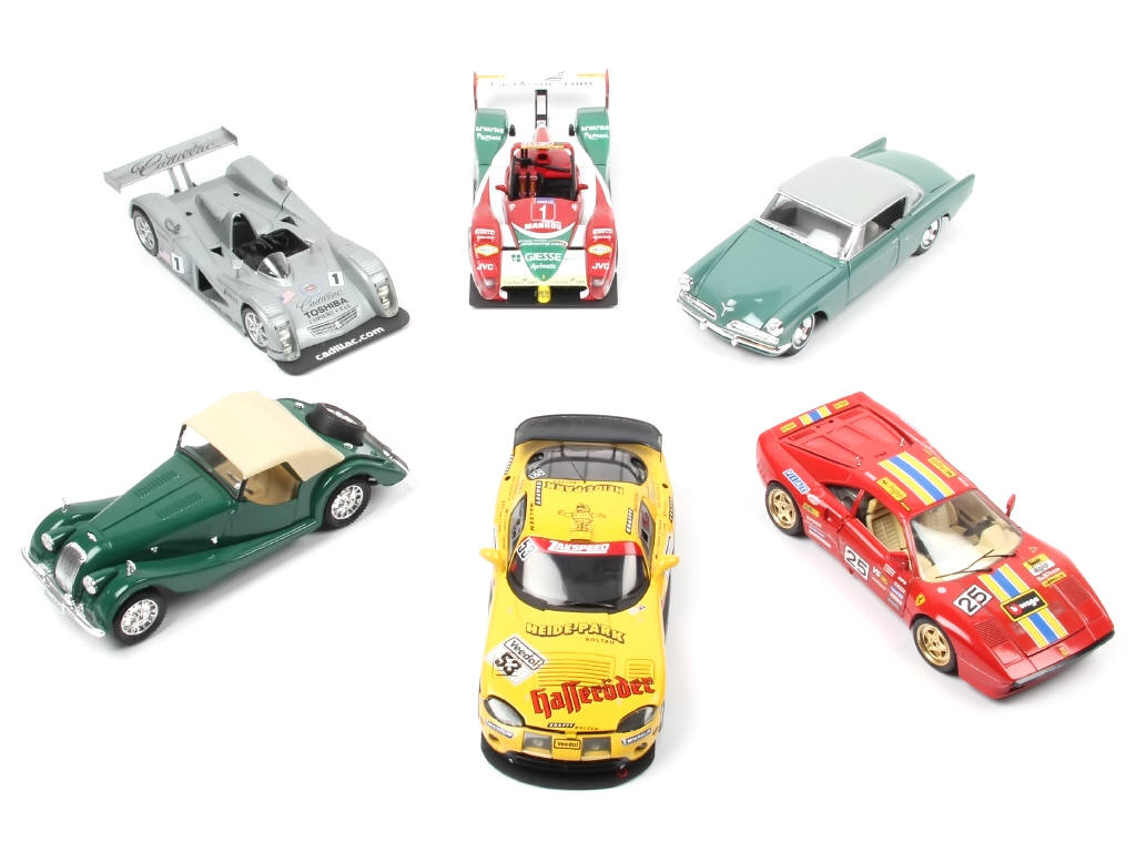grandes échelles - miniatures reproduisant les modèles : FERRARI, MORGAN & CADILLAC - on y retrouve notamment les marques : POLISTIL, AUTOART, BBURAGO & MAISTO - quelques petits manques & éléments cassés