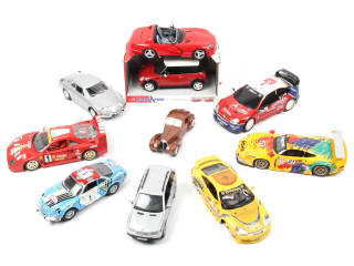 grandes échelles - miniatures reproduisant notamment les modèles : MINI (en boîte état 'b'), PORSCHE (un exemplaire incomplet avec pare-brise déformé) & ALPINE - on y retrouve notamment les marques : DICKIE, BBURAGO & UT MODELS - avec manques & parties cassées (plus ou moins importants suivant les modèles)