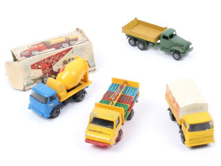 comprend : BERLIET GAK toupie à béton, STRADAIR plateau brasseur KANTERBRAU & MERCEDES plateau à ridelles bâché - on y joint un camion GMC (état 'b'-'e', carrosserie très encrassée) de la marque FRANCE JOUETS - avec manques & parties cassées