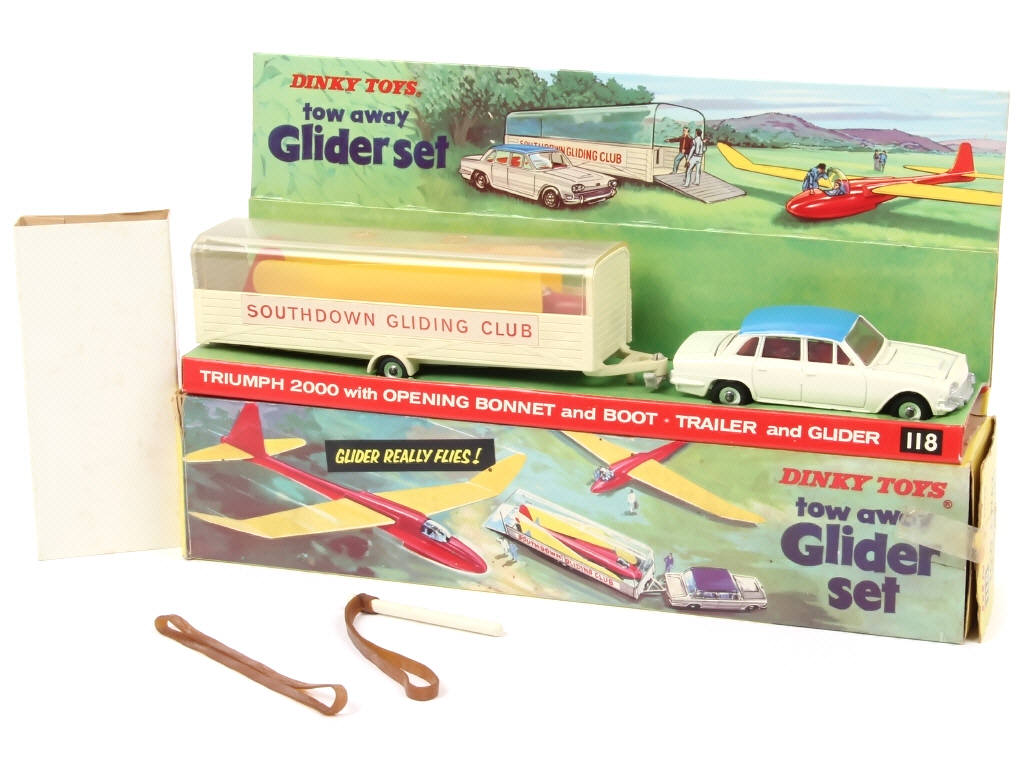 DINKY TOYS (GB) 118 TRIUMPH 2000 & Remorque avec planeur crème, toit bleu