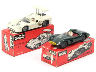 comprend : ASTON MARTIN 3L (état 'A'-'c', suspensions plus ou moins affaissées, boîte tachée avec manques de papier) & CHAPARRAL 2F (état 'B'-'b', avec petite planche de décalques, 2 petits détails de peinture noire ajoutés)