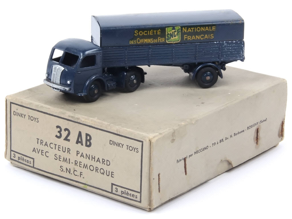 DINKY TOYS (FRANCE) 32AB PANHARD Semi-remorque 'S.N.C.F' (version avec intérieur de toit lisse) bleu foncé (fond de l'écusson uni), version à décalques