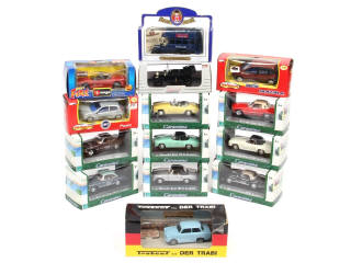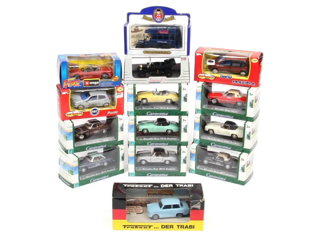 comprend les modèles : FIAT, FORD, TRABANT & MERCEDES - on y retrouve les marques : BBURAGO, CARARAMA, MAJORETTE, UNIVERSAL HOBBIES & VITESSE - quelques boites en état 'c'