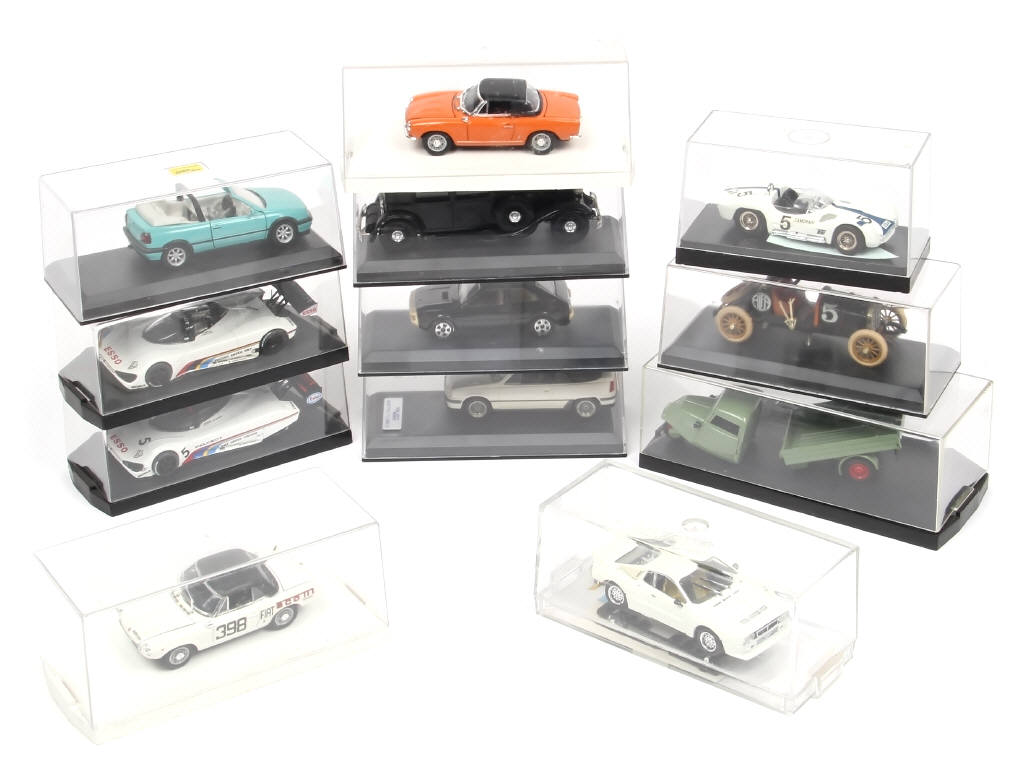 comprend notamment les modèles : RENAULT, VOLKSWAGEN, PEUGEOT, OPEL & SEAT - on y retrouve notamment les marques : GAMA, SCHUCO, SOLIDO, SCHABAK & VITESSE - boites pour la plupart non conformes aux modèles - un exemplaire encrassé & un autre en état 'R' - quelques manques & parties cassées