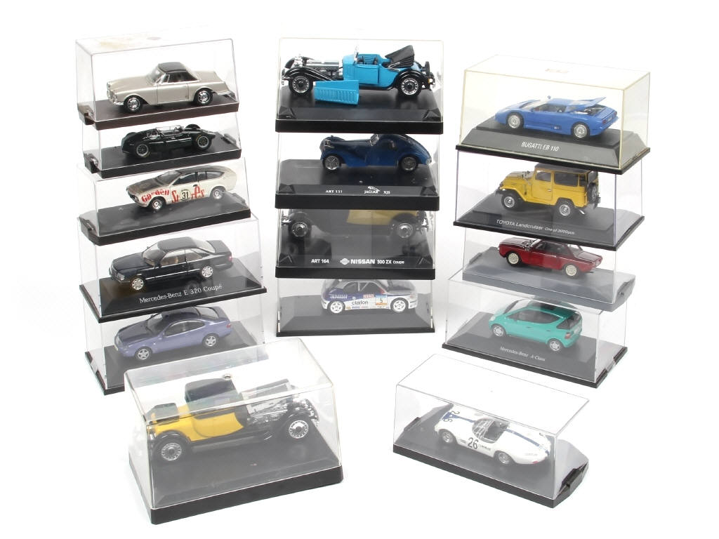 comprend notamment les modèles : BUGATTI, MERCEDES, TOYOTA, PEUGEOT, ALFA ROMEO & FACEL VEGA - plusieurs modèles désolidarisés de leur socle (possibilité de petits accessoires cassés) - un exemplaire en état 'C' - on y retrouve notamment les marques : BRUMM, PROJETTO K, RIO, SOLIDO, EXEM & VITESSE - certaines boites non conformes aux modèles dont quelques unes avec fêlures