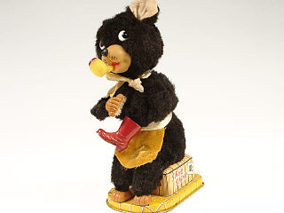 référence 23C du livre de BRIAN MORAN 'BATTERY TOYS' - hauteur 23 cm - en action, l'ours cire sa botte - la tête bascule de droite à gauche & la pipe s'allume - mécanismes fonctionnent - 23 cm high - in action, the bear waxes her boot - her head moves from side to side & the pipe lights up - in working condition - SCARCE