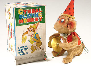 hauteur 21 cm - en action, le singe avance sur son derrière tout en jouant des cymbales - mécanismes fonctionnent - 21 cm high - in action, the monkey moves forward on his bottom whilst playing the cymbals - in working condition