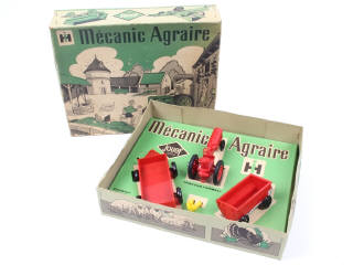 dimensions du coffret : 30 x 24 cm - contient : un tracteur agricole FARMALL (moteur à ressort fonctionne), une remorque benne-basculante INTERNATIONAL, un chariot, un conducteur & cale de présentation - boîte encrassée