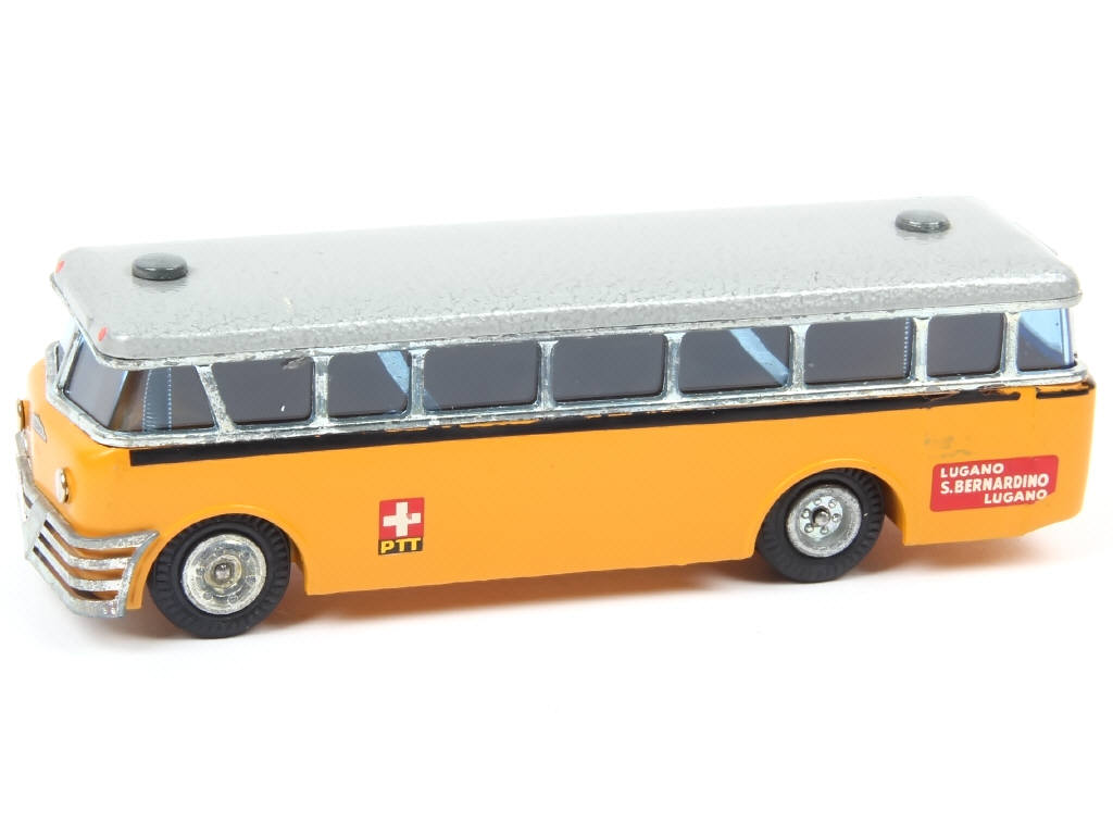 avec décalques latéraux 'LUGANO S.BERNADINO LUGANO' - manques de pellicule chromée sur les entourages de fenêtres & sur les décalques - caches-vis de toit ternis (micro-frottements sur l'avant de celui-ci)