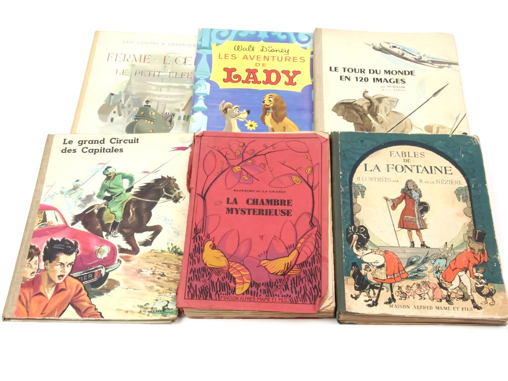 comprend : FABLES DE LA FONTAINE illustrées par R. DE LA NEZIERE, LA CHAMBRE MYSTERIEUSE, LE GRAND CIRCUIT DES CAPITALES, LE TOUR DU MONDE EN 120 IMAGES, LES AVENTURES DE LADY & FERME L'OEIL LE PETIT ELFE - assez bon état général - quelques parties recollées avec du ruban adhésif