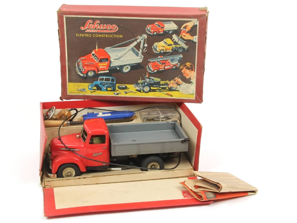 contient un camion benne basculante (avec avertisseur sonore & direction, fonctionnent), un boîtier à pile (état 'B', légèrement déformé, jauni avec une fêlure), câblage, un volant directionnel, 2 clefs (dont une non d'origine), différents accessoires (dont un tournevis), cales & notice - possibilité de petits accessoires manquants (une ampoule manquante) - carrosserie légèrement encrassée