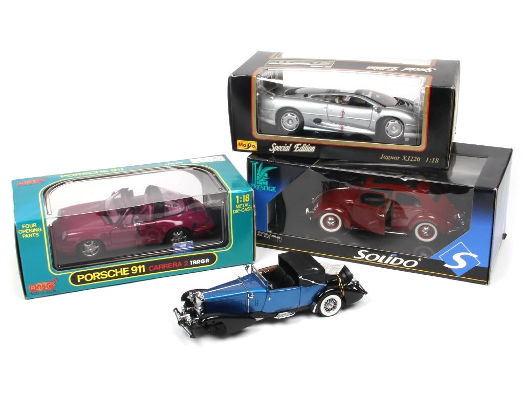 échelle 1/18ème - comprend : PORSCHE 911 CARRERA, JAGUAR XJ220, VOLKSWAGEN COCCINELLE & DUESENBERG J VICTORIA 1933 (manque une roue sans parties cassées - boite sans suremballage) - on y retrouve les marques : ANSON, MAISTO, SOLIDO & FRANKLIN