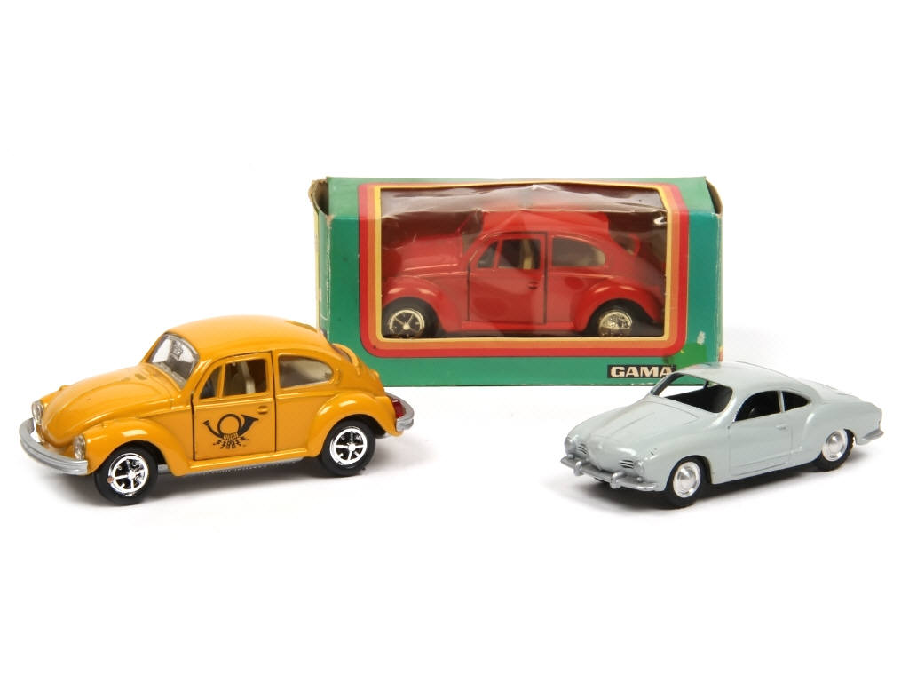 comprend : VOLKSWAGEN COCCINELLE & KARMANN GHIA (micro-éclats & taches dans la peinture de la carrosserie) - on y retrouve les marques : GAMA & MÄRKLIN - une boite en état 'b'