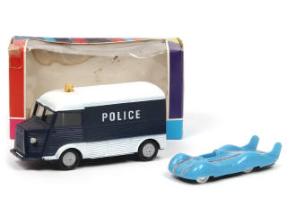 comprend : CITROEN 1200 KG 'POLICE' (manque une petite porte battante à l'arrière - boite en état 'c') & RENAULT ETOILE FILANTE (taches sur la carrosserie) - on y retrouve les marques : MINIALUXE & LES ROULIERS