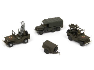 FRANCE JOUETS (FRANCE) Ensemble de 3 véhicules militaires & une remorque
