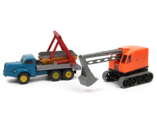 comprend : BERLIET TBO multi-benne (référence 116) & pelle-mécanique (référence 112) - carrosseries légèrement encrassées & déformées - quelques traces d'oxydation