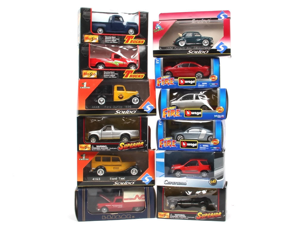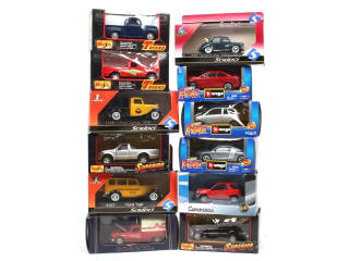 comprend notamment les modèles : PEUGEOT, TOYOTA, RENAULT & FORD - on y retrouve notamment les marques : CARARAMA, BBURAGO, SOLIDO, MAISTO & ELIGOR - possibilité de quelques accrocs sur les boites dont certaines en état 'c'