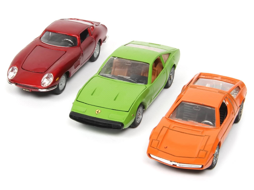 comprend : FERRARI 275 GTB, 365 GTC-4 & MASERATI BORA - on y retrouve les marques : POLITOYS & MEBETOYS