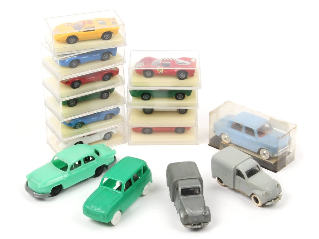 différentes échelles - on y retrouve les marques : CHAMPION (boîtes état 'b' avec 3 cartons de socles manquants), SESAME, CREPREUX, CLE & NOREV (en boîte état 'c') - certaines carrosseries plus ou moins encrassées avec traces de colle d'origine par endroits