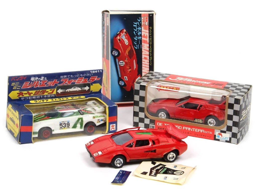 comprend les modèles : LAMBORGHINI, DE TOMASO (avec moteurs à friction - fonctionnent) & LANCIA (moteur à pile - non testé) - on y retrouve les marques : SHINSEI & BANDAI