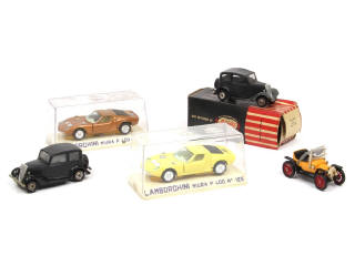 comprend : LAMBORGHINI MUIRA, FIAT BALILLA & LE ZEBRE - on y retrouve les marques : JOAL & MINI CARS - certains modèles avec oxydation & humidité - boites en états de 'b' à 'd' (un modèle sans)